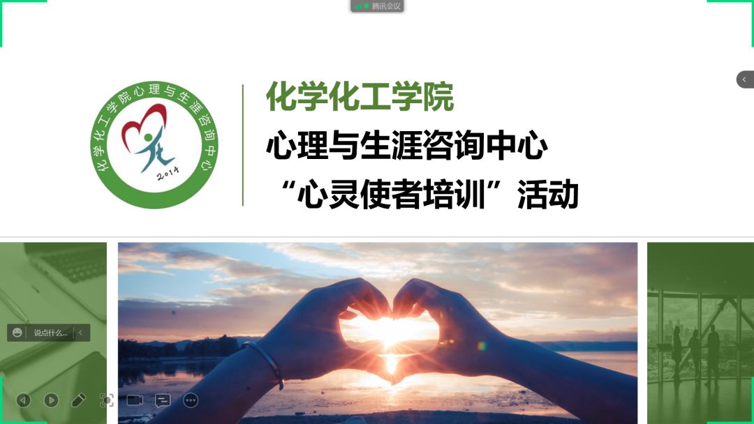 晚上7點(diǎn),全體成員準(zhǔn)時(shí)進(jìn)入線上會(huì)議室,活動(dòng)正式開始。主持人簡(jiǎn)述了活動(dòng)的基本流程,并強(qiáng)調(diào)了相關(guān)注意事項(xiàng)。主持人首先播放了兩個(gè)心理知識(shí)的小短片,學(xué)生對(duì)如何解決心理困惑有了初步的了解。然后,孫曉爽老師從大學(xué)生心理發(fā)展特點(diǎn)、常見的心理問(wèn)題、如何培養(yǎng)健康心理、校內(nèi)尋求心理咨詢的方法途徑等四個(gè)方面為與會(huì)人員進(jìn)行全面講解,最后針對(duì)心靈使者的工作職能做了進(jìn)一步的闡述,孫老師強(qiáng)調(diào)心靈使者首先要保證自己的身心健康,然后才能充分了解班級(jí)同學(xué)的心理健康狀況及波動(dòng)情況,及時(shí)與班主任、輔導(dǎo)員老師反饋信息,做好學(xué)生與老師之間的橋梁紐帶。隨后,中心負(fù)責(zé)人喬帥超對(duì)心理與生涯咨詢中心進(jìn)行了簡(jiǎn)短的介紹,講述了中心與心靈使者的關(guān)系,心靈使者是班級(jí)開展心理活動(dòng)的組織者和實(shí)施者,也是心理困惑學(xué)生的朋輩引導(dǎo)者。活動(dòng)的最后,2020級(jí)優(yōu)秀心靈使者代表石菲菲向同學(xué)們分享自己一年來(lái)工作經(jīng)驗(yàn),使同學(xué)們更加清晰地認(rèn)識(shí)到心靈使者的責(zé)任與擔(dān)當(dāng)。
