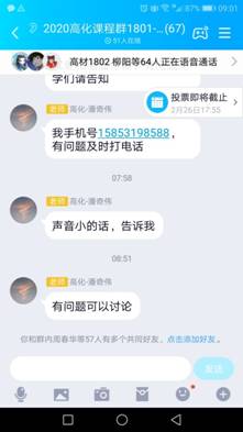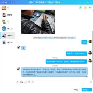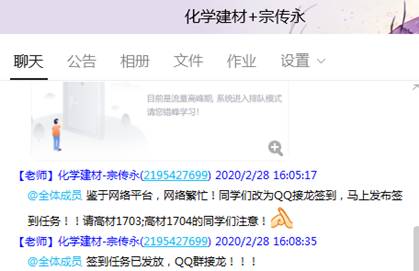 宗老師利用寒假的時(shí)間,在課程開課前在學(xué)校的網(wǎng)絡(luò)平臺建設(shè)了化學(xué)建材在線課程,課前還通過QQ文件傳送了課件、輔助學(xué)習(xí)資料等,為學(xué)生提供了充分的學(xué)習(xí)資源。課前5分鐘嘗試學(xué)習(xí)通簽到,發(fā)現(xiàn)網(wǎng)絡(luò)擁堵,馬上啟動預(yù)案,通過QQ接龍簽到,學(xué)生全部按時(shí)簽到。正式開始上課后再次提醒學(xué)習(xí)的重點(diǎn)內(nèi)容。上課過程中,以學(xué)生在線學(xué)習(xí)為主,同時(shí)通過自學(xué)照片、個(gè)別互動答疑等方式抽查學(xué)生的學(xué)習(xí)狀態(tài)和效果。課后發(fā)布了課下作業(yè),并給出了明確的作業(yè)要求和時(shí)間要求。