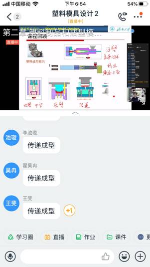 高分子專業(yè)的劉繼濤老師給高材1704-1707四個(gè)班上的課是塑料模具設(shè)計(jì),雖然課程安排在晚上,但是沒有一個(gè)人缺課。四個(gè)班有112位同學(xué)同時(shí)在線,整個(gè)上課過程依然非常順暢。劉老師提前15分鐘就分別在QQ群和釘釘群提醒大家準(zhǔn)備上課。18:40準(zhǔn)時(shí)上課。從精致的課件和流暢的講解可以看出劉老師在課前做了充分的準(zhǔn)備。利用數(shù)位板手寫輸入,將板書與PPT相結(jié)合,使問題講解更加清晰明了。