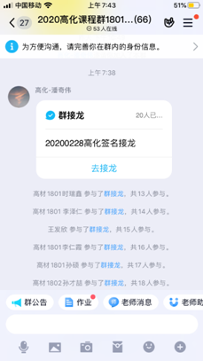 從聽課情況看,三位老師都做了充分地認(rèn)真準(zhǔn)備,一個(gè)星期的師生磨合網(wǎng)上授課初見成效。老師們在講課過程中沒有因?yàn)槭蔷W(wǎng)絡(luò)授課有一絲的懈怠,全力以赴投入,并在課程間隙讓學(xué)生寫下問題,并QQ群里討論答疑。為了保證教學(xué)效果和學(xué)生參與度,每個(gè)老師各有特色。潘奇?zhèn)ダ蠋煹恼n程是八點(diǎn)開課,他提前半小時(shí)7:30就開始在QQ群里開始讓學(xué)生進(jìn)行接龍簽到,從而保證了學(xué)生全部在線聽課,見下圖。在QQ群答疑。王廬巖老師應(yīng)用的是雨課堂,在課程間隙回答學(xué)生的問題。劉繼濤老師用釘釘群直播授課,學(xué)生們可以直接看到老師在講課,并注重課堂互動,學(xué)生可以用文字直接回答老師的提問,課件做得很驚艷。