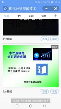 劉廣寧老師的《現(xiàn)代分析測試技術(shù)》,采用釘釘直播和雨課堂互動相結(jié)合的授課方式,釘釘直播的優(yōu)勢在于播放流暢且學(xué)生課后可以看課程回放,老師還能監(jiān)控到每個(gè)學(xué)生的觀看時(shí)長。劉廣寧老師對于課程做了多種預(yù)案,準(zhǔn)備充分,課件圖文并茂,動畫演示效果好,并能夠結(jié)合實(shí)際應(yīng)用和科研講解顯微鏡的應(yīng)用,課堂氣氛活躍,學(xué)生全部在線聽課并有積極互動。