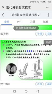 6. 釘釘直播和雨課堂互動相結(jié)合的授課方式,釘釘直播的優(yōu)勢在于播放流暢且學(xué)生課后可以看課程回放,老師還能監(jiān)控到每個(gè)學(xué)生的觀看時(shí)長。老師對于課程做了多種預(yù)案,準(zhǔn)備充分,課件圖文并茂,動畫演示效果好,并能夠結(jié)合實(shí)際應(yīng)用和科研講解顯微鏡的應(yīng)用,課堂氣氛活躍,學(xué)生全部在線聽課并有積極互動。