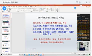 高分子系劉繼濤老師采用“釘釘群視頻直播授課+QQ群交流“的方式,進(jìn)行《塑料模具設(shè)計(jì)》課程的授課。音頻、視頻比較流暢,通過(guò)共享屏幕放映PPT,配合手寫板授課,98名同學(xué)全程參與課程直播,積極回答問(wèn)題、參與討論和投票,達(dá)到了預(yù)期效果。