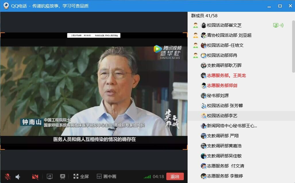 4月5日晚7:00,心連心愛心社參與人員陸續(xù)加入線上會(huì)議室。活動(dòng)伊始,活動(dòng)主辦人利用屏幕分享的方式組織同學(xué)們觀看影片《英雄之城》。影片結(jié)束后,在主持人的組織下,同學(xué)們?cè)诨顒?dòng)群內(nèi)以文字的形式寫下了自己的觀后感,“哪有什么歲月靜好,只不過是有人替你負(fù)重前行。”是同學(xué)們對(duì)英雄事跡的感懷;“當(dāng)我們調(diào)侃‘終于到了躺在床上一動(dòng)不動(dòng)就可以為祖國(guó)做貢獻(xiàn)的時(shí)候’,請(qǐng)記住有這樣一群人正在用血肉之軀為我們戰(zhàn)斗!”是同學(xué)們對(duì)英雄們的深切致敬。緊接著,同學(xué)們利用文字、語音、視頻等形式分享交流各自了解的抗疫故事,并討論總結(jié)了我們應(yīng)從中學(xué)習(xí)的品質(zhì)。最后,活動(dòng)參與人員進(jìn)行簽到,活動(dòng)圓滿落下帷幕。