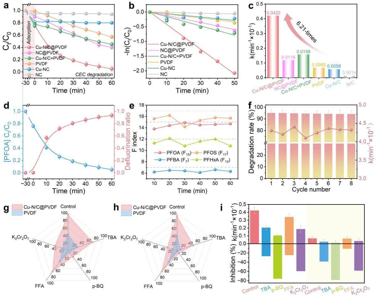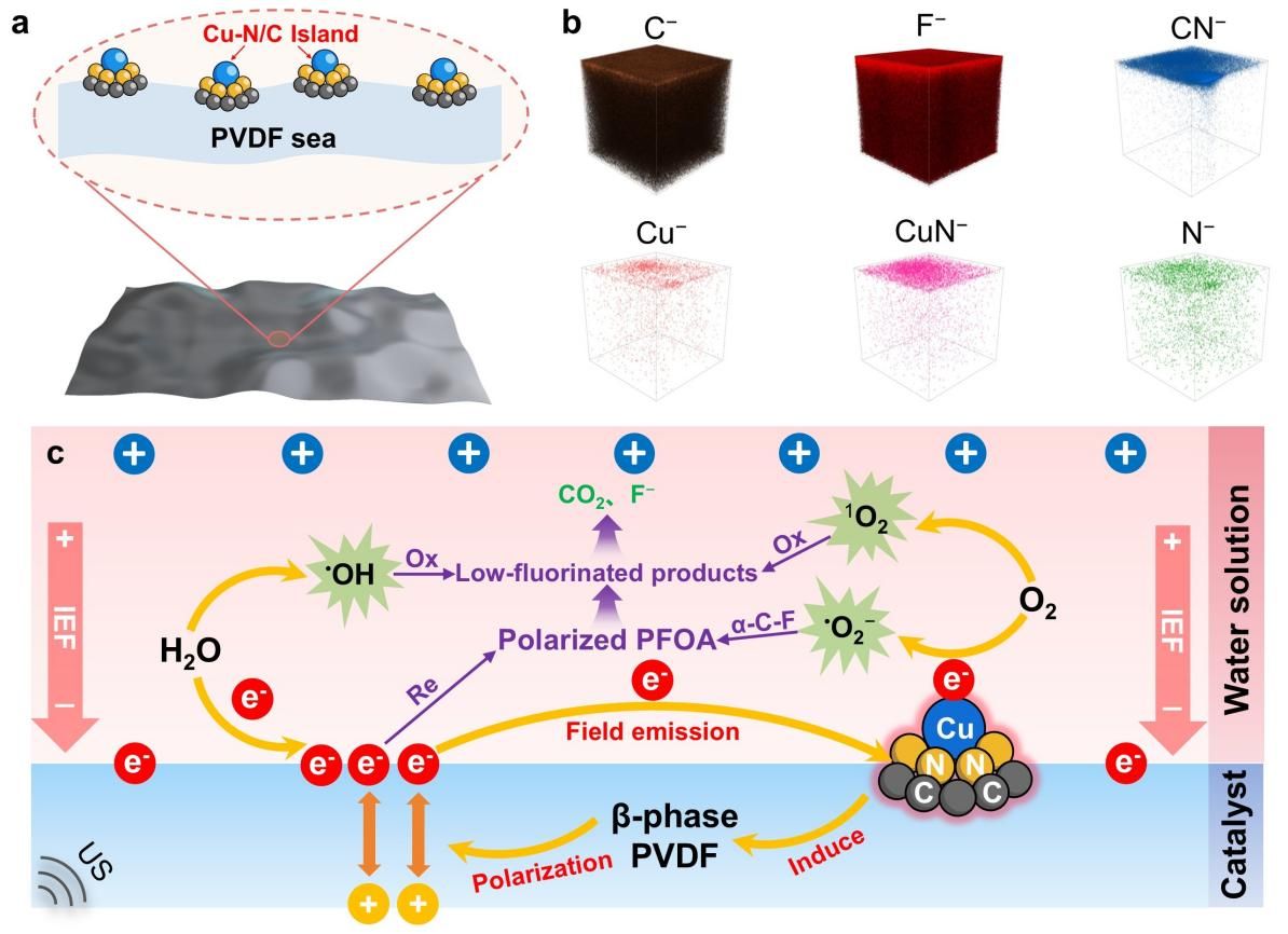 研究發(fā)現(xiàn),通過(guò)在聚偏氟乙烯(PVDF)基質(zhì)中嵌入原子級(jí)分散的Cu-N4位點(diǎn),能夠觸發(fā)界面電子轉(zhuǎn)移并誘導(dǎo)PVDF的β相結(jié)晶,從而顯著增強(qiáng)壓電極化和界面電場(chǎng)(IEFs)。這種獨(dú)特的配置通過(guò)場(chǎng)發(fā)射效應(yīng)驅(qū)動(dòng)電子從PVDF基質(zhì)定向注入Cu-N4活性中心。富電子的銅位點(diǎn)能夠活化溶解氧生成?O2?,通過(guò)親核攻擊誘導(dǎo)C-F鍵極化并斷裂。隨后,系統(tǒng)產(chǎn)生的?OH和1O2協(xié)同作用,將低氟中間體徹底氧化礦化,構(gòu)建了高效的級(jí)聯(lián)還原-氧化路徑。