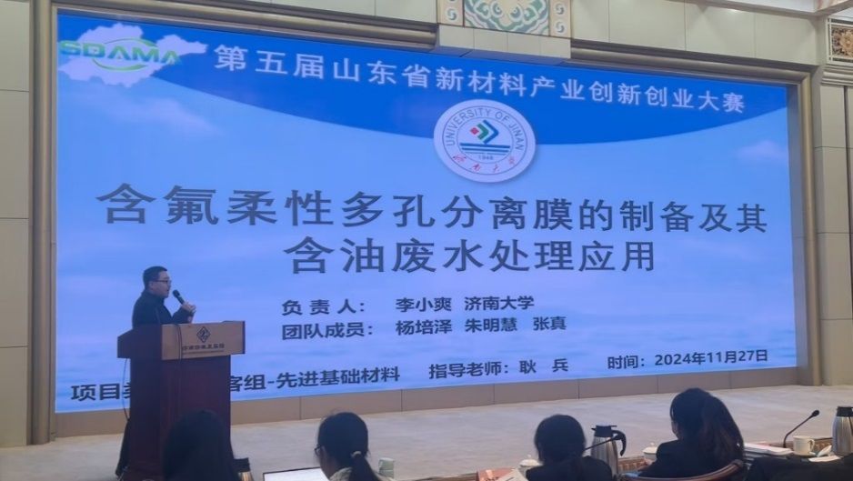 11月27日,第五屆山東省新材料產(chǎn)業(yè)創(chuàng)新創(chuàng)業(yè)大賽決賽在濟(jì)南舉行。我院由耿兵教授指導(dǎo),李小爽、楊培澤、朱明慧、張真同學(xué)完成的《含氟柔性多孔分離膜的制備及其含油廢水處理應(yīng)用》項(xiàng)目順利晉級創(chuàng)客組決賽,并在決賽中榮獲一等獎(jiǎng)。
