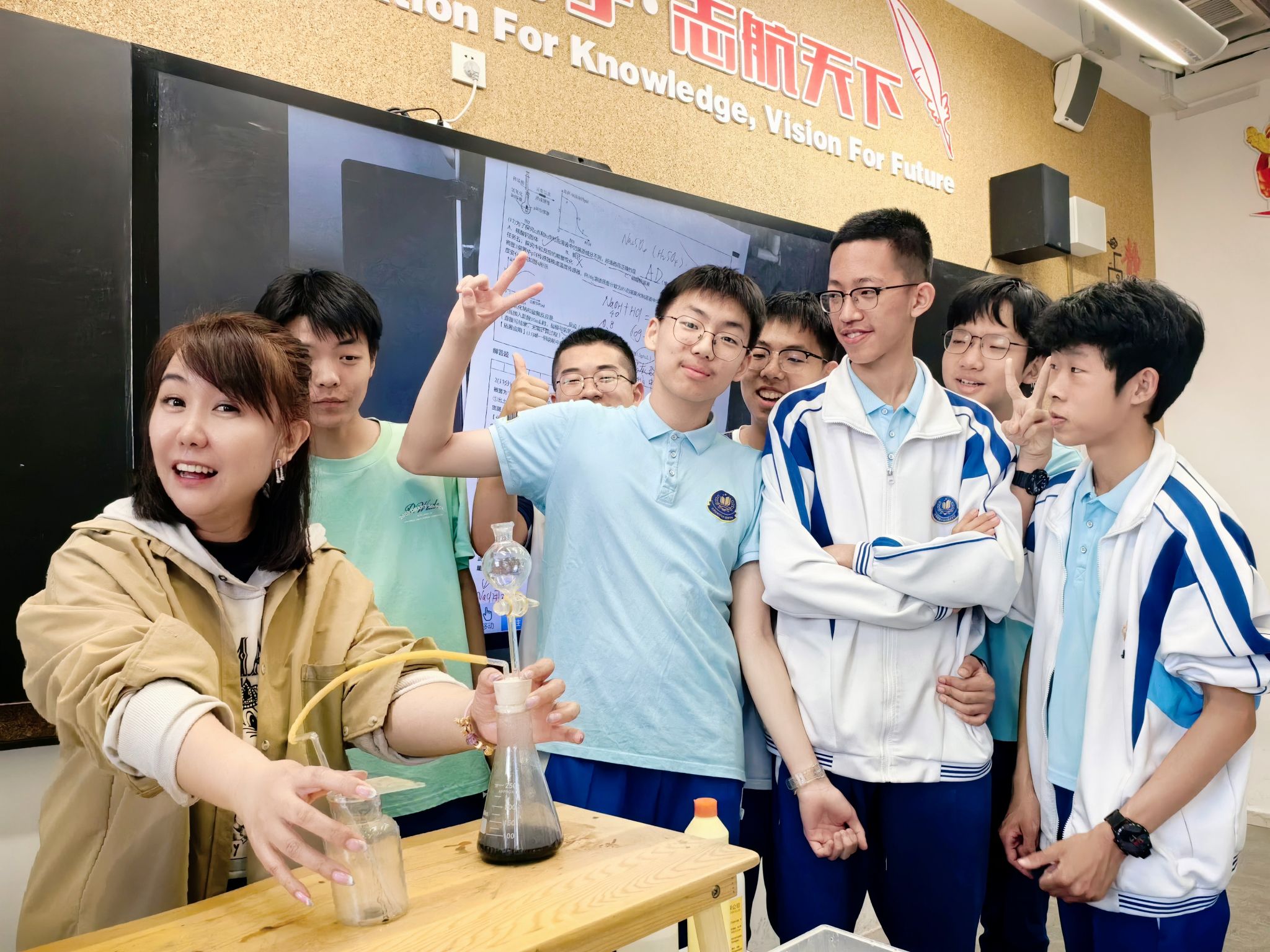 走進(jìn)社會(huì)生活,同學(xué)們發(fā)現(xiàn)單靠一個(gè)學(xué)科的知識(shí)是解決不了所有問題的,應(yīng)嘗試與其他學(xué)科的融合發(fā)展,不斷擴(kuò)大“+”的內(nèi)涵。所以,馬老師主動(dòng)聯(lián)系本校物理、生物組一起進(jìn)行“實(shí)驗(yàn)+”的聯(lián)合開發(fā)。這也正契合了“中國教育現(xiàn)代化2035”推出的八大基本理念之——“注重融合發(fā)展”。科學(xué)學(xué)科的老師們?cè)谒膸ьI(lǐng)下,用“項(xiàng)目式學(xué)習(xí)”的方式帶動(dòng)學(xué)科融合,每一個(gè)項(xiàng)目從海報(bào)到宣傳視頻,從實(shí)踐到總結(jié)都由理綜工作室成員設(shè)計(jì)并實(shí)施。如此,馬立霞老師引領(lǐng)下的化學(xué)及科學(xué)學(xué)習(xí)不斷散發(fā)出一種獨(dú)特的生命力!