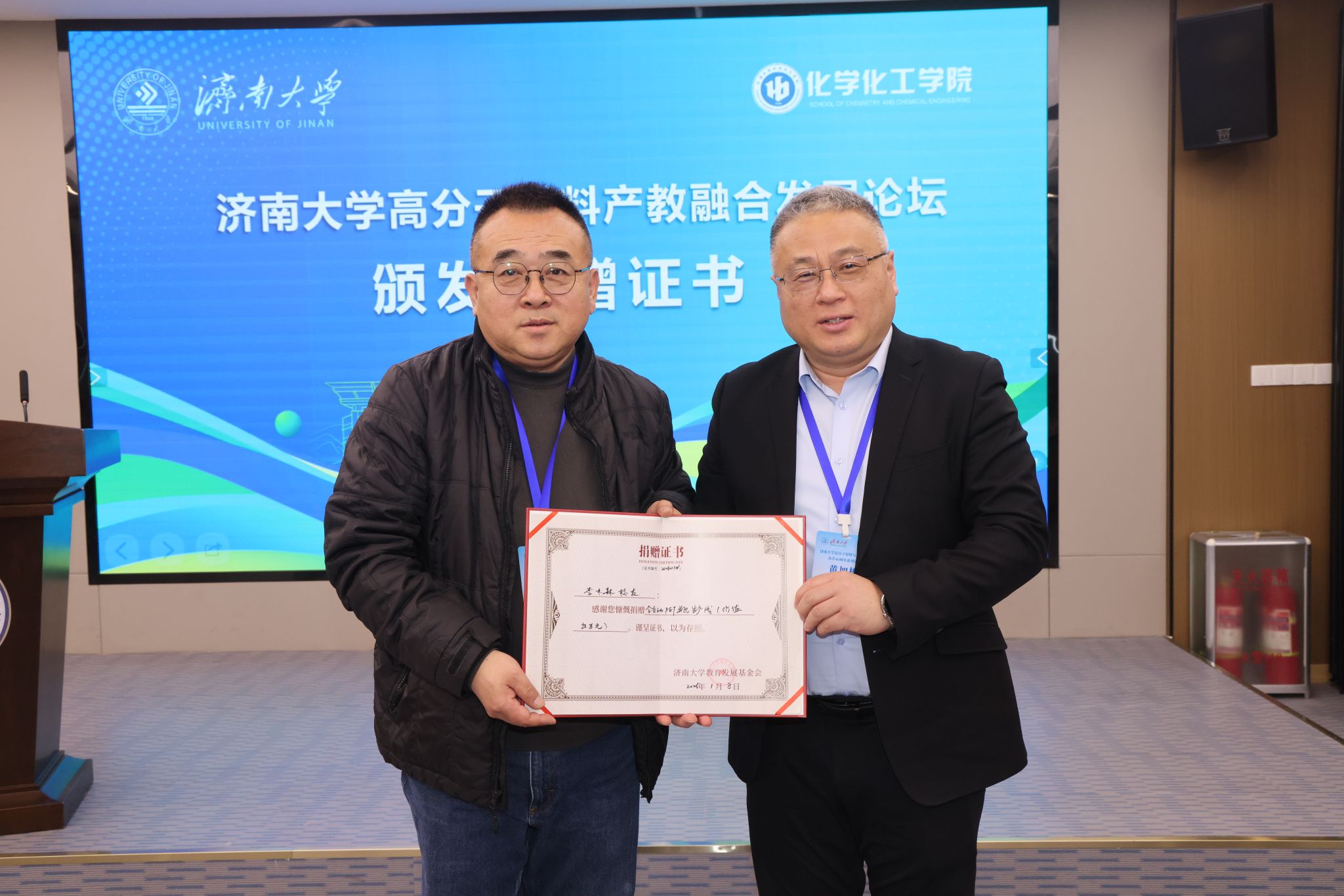10日下午,濟(jì)南大學(xué)黨委常委、副校長(zhǎng)黃加棟出席“濟(jì)南大學(xué)高分子材料產(chǎn)教融合發(fā)展論壇暨山東省先進(jìn)高分子材料現(xiàn)代產(chǎn)業(yè)學(xué)院建設(shè)論壇”,并為1988屆校友李木森頒發(fā)教學(xué)設(shè)備捐贈(zèng)證書。