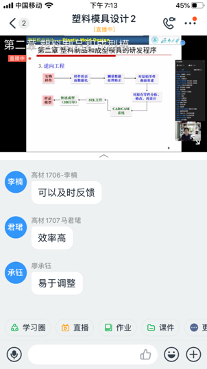 高分子專業(yè)的劉繼濤老師給高材1704-1707四個(gè)班上的課是塑料模具設(shè)計(jì),雖然課程安排在晚上,但是沒有一個(gè)人缺課。四個(gè)班有112位同學(xué)同時(shí)在線,整個(gè)上課過程依然非常順暢。劉老師提前15分鐘就分別在QQ群和釘釘群提醒大家準(zhǔn)備上課。18:40準(zhǔn)時(shí)上課。從精致的課件和流暢的講解可以看出劉老師在課前做了充分的準(zhǔn)備。利用數(shù)位板手寫輸入,將板書與PPT相結(jié)合,使問題講解更加清晰明了。