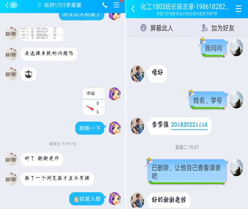 1)教學(xué)辦教師全天在線,通過電話、QQ、微信等通訊手段遠(yuǎn)程指導(dǎo)學(xué)生選課,及時解決學(xué)生在選課過程中遇到的各種問題。