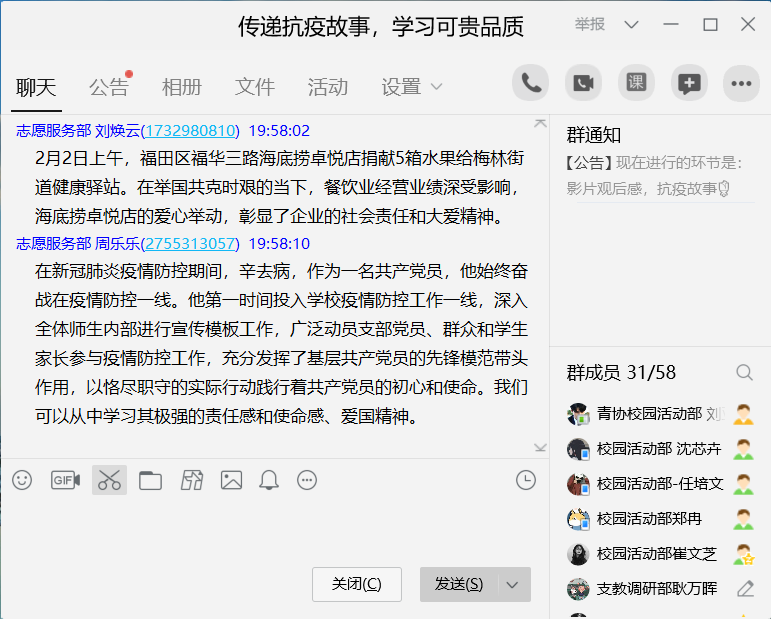 4月5日晚7:00,心連心愛心社參與人員陸續(xù)加入線上會(huì)議室。活動(dòng)伊始,活動(dòng)主辦人利用屏幕分享的方式組織同學(xué)們觀看影片《英雄之城》。影片結(jié)束后,在主持人的組織下,同學(xué)們?cè)诨顒?dòng)群內(nèi)以文字的形式寫下了自己的觀后感,“哪有什么歲月靜好,只不過是有人替你負(fù)重前行。”是同學(xué)們對(duì)英雄事跡的感懷;“當(dāng)我們調(diào)侃‘終于到了躺在床上一動(dòng)不動(dòng)就可以為祖國(guó)做貢獻(xiàn)的時(shí)候’,請(qǐng)記住有這樣一群人正在用血肉之軀為我們戰(zhàn)斗!”是同學(xué)們對(duì)英雄們的深切致敬。緊接著,同學(xué)們利用文字、語音、視頻等形式分享交流各自了解的抗疫故事,并討論總結(jié)了我們應(yīng)從中學(xué)習(xí)的品質(zhì)。最后,活動(dòng)參與人員進(jìn)行簽到,活動(dòng)圓滿落下帷幕。