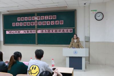 晚上6:40,所有參與人員準(zhǔn)時(shí)到場,主持人宣布大會正式開始,并介紹參與本次會議的老師以及主席團(tuán)成員。化學(xué)化工學(xué)院團(tuán)委委員丁戰(zhàn)宇宣讀團(tuán)總支相關(guān)任命決定。隨后進(jìn)行2018級和2019級的“活力團(tuán)支部”評選。各團(tuán)支部書記向大家展示精心準(zhǔn)備的課件,發(fā)表了自我團(tuán)支部風(fēng)采展示,向大家介紹了其支部的組成及發(fā)展運(yùn)轉(zhuǎn)情況、班風(fēng)學(xué)風(fēng)建設(shè)、參加活動(dòng)比賽情況以及工作上的不足及未來規(guī)劃,表示會在校團(tuán)委、院團(tuán)委的帶領(lǐng)下,認(rèn)真學(xué)習(xí)團(tuán)員規(guī)章制度,做好新時(shí)代新青年。會議最后,由李健慧老師作總結(jié)發(fā)言,希望團(tuán)干部能堅(jiān)定理想信念,踏實(shí)學(xué)習(xí),起到良好的帶頭作用,并轉(zhuǎn)達(dá)團(tuán)委老師對各個(gè)團(tuán)支部工作的肯定。活動(dòng)在大家的掌聲中落下帷幕。