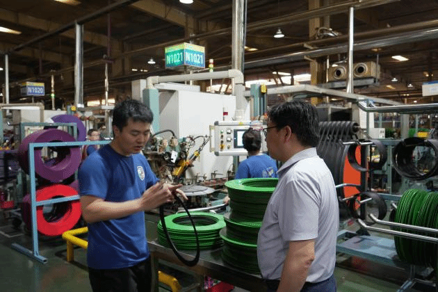 學(xué)院一行首站抵達(dá)山東華盛橡膠有限公司,技術(shù)研發(fā)中心副主任、山東宏盛科技有限公司總經(jīng)理陳建軍,技術(shù)研發(fā)中心部長徐凱,技術(shù)研發(fā)中心部長朱新靜等熱情接待。學(xué)院一行參觀了企業(yè)研發(fā)中心,詳細(xì)了解了公司在橡膠制品研發(fā)、新材料應(yīng)用等領(lǐng)域的技術(shù)突破與創(chuàng)新成果。隨后,雙方深入一線生產(chǎn)車間,實(shí)地考察智能化生產(chǎn)線與精益化管理模式,直觀感受產(chǎn)業(yè)升級對技術(shù)技能型人才的迫切需求。