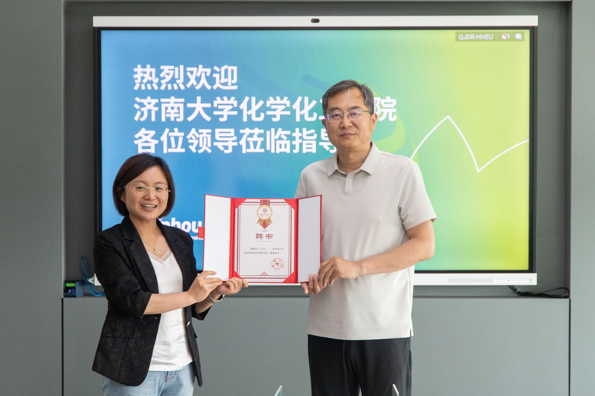為促進(jìn)校企資源對接,搭建人才共育平臺,雙方簽署《濟(jì)南大學(xué)畢業(yè)生就業(yè)實(shí)習(xí)基地》協(xié)議并揭牌,賀銘為潤豐化工股份有限公司招聘經(jīng)理王艷艷頒發(fā)濟(jì)南大學(xué)“就業(yè)導(dǎo)師”聘書。